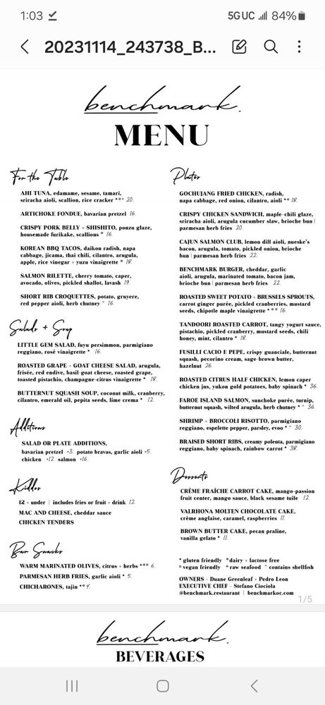 Located in Santa Ana, CA, Benchmark is a New American restaurant that offers a diverse menu suitable for various dietary preferences, including pescatarian and vegan options. The restaurant prides itself on being inclusive and accessible, with amenities such as wheelchair accessibility, ADA-compliant facilities, and options for outdoor seating. Additionally, Benchmark is known for its trendy and intimate atmosphere, making it a popular choice for a range of occasions, from brunch to dinner. The restaurant also offers catering services and happy hour specials, ensuring a memorable dining experience for groups and individuals alike. With a Latinx and LGBTQ-owned establishment, Benchmark goes beyond just serving delicious food but also aims to create a welcoming and inclusive space for all.